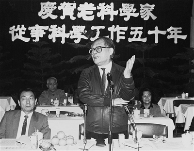 上图:1988年10月,江泽民同志在上海庆贺老科学家从事科学工作五十年座谈会上讲话。
