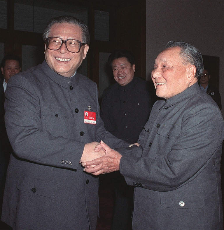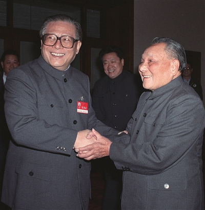 右图:1989年11月6日至9日,中国共产党第十三届中央委员会第五次全体会议在北京召开。这是邓小平同志和江泽民同志亲切握手。