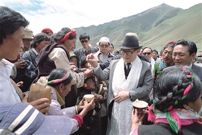 上图:1990年7月25日,江泽民同志与藏族群众共庆望果节。
