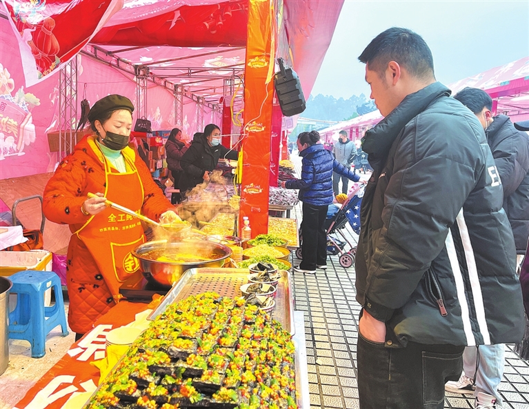 百种货品任挑,体验“一站式”购年货。马边绿茶、雷波脐橙、川香腊味、糖饼果子、特色小吃……应有尽有,市民可尽情开启“舌尖之旅”。