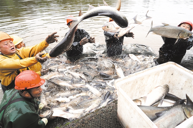 “重型拖网打鱼表演”是打鱼节活动的重头戏。打鱼队员有序地下网、拖网,将库中的鱼儿慢慢聚集。“一、二、三!加油干咯!一二三咯!”眼看鱼多网沉,岸上群众也忍不住出手相助。随着大网最后收拢,肥美的鱼儿在网中活蹦乱跳起来。观众们欢呼喝彩,纷纷拿起相机和手机,记录下丰收喜庆的瞬间。