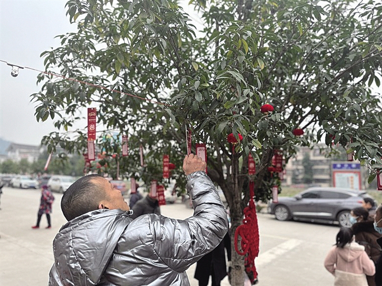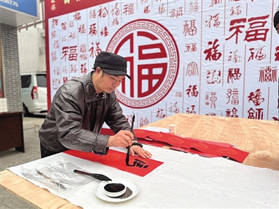本报讯 (记者 黄曦 文/图)昨(16)日,沙湾区福禄镇首届“福禄年货节”拉开序幕。活动邀请峨眉山松柏画院的老师,现场写春联、送“福”字,为群众定制“专属年味”,送上真诚祝福。在猜灯谜区域,大家你一言、我一语,分析谜面、探索谜底。
